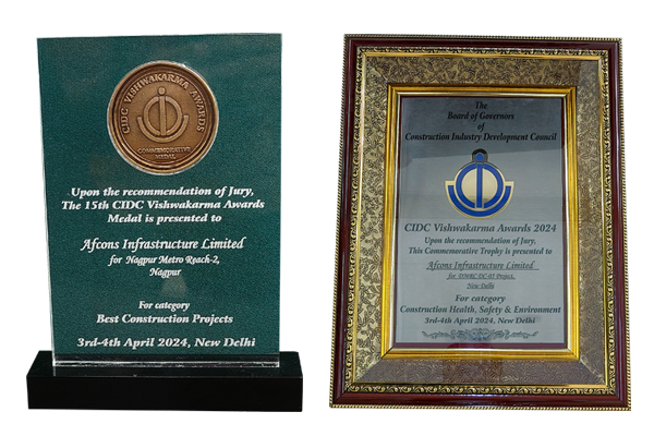 Afcons won two awards at the 15th CIDC Vishwakarma Awards in New Delhi on April 4, 2024. The Nagpur Metro Reach-2 project won the award in the Best Construction Projects category, while the Delhi Metro DC-05 won in the Construction Health, Safety, and Environment category.